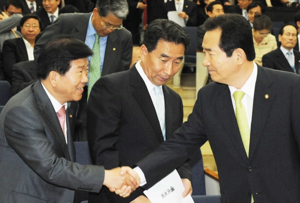 ▲ 9일 오전 국회 회의실에서 열린 민주당 의원총회에서 정세균 대표와 박병석 정책의장이 이야기를 나누고 있다. (뉴시스) |