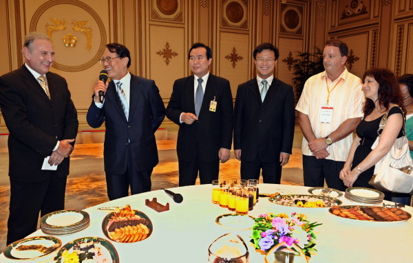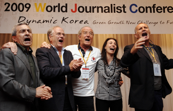 | ▲ 9일 오후 제주도 서귀포 칼호텔에서 열린 세계기자의 밤 행사에서 이탈리아 기자단이 자국의 민요를 열창하고 있다.(뉴시스) | ||