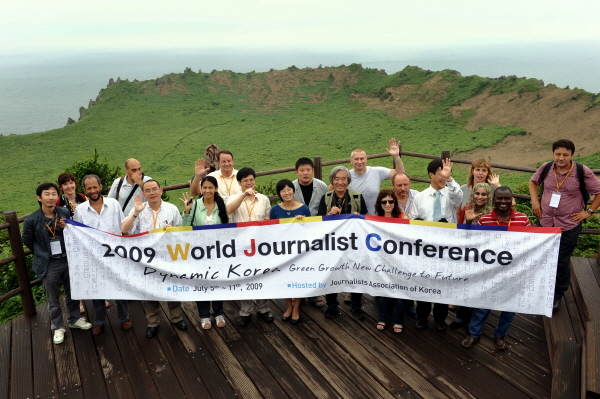 | ▲ 10일 오전 제주도의 세계자연유산 탐방에 나선 '2009 세계 저널리스트 컨퍼런스(2009 World Journalist Conference)' 기자단이 서귀포의 성산일출봉에 올라 제주의 자연의 아름다움을 감상하고 있다.(뉴시스) | ||
