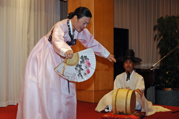 | ▲ 9일 오후 제주도 서귀포 칼호텔에서 열린 세계기자의 밤 행사에서 김미나 명창이 세계 각국의 기자들 앞에서 판소리 심청가와 춘향가 등을 선보이고 있다.(뉴시스) | ||