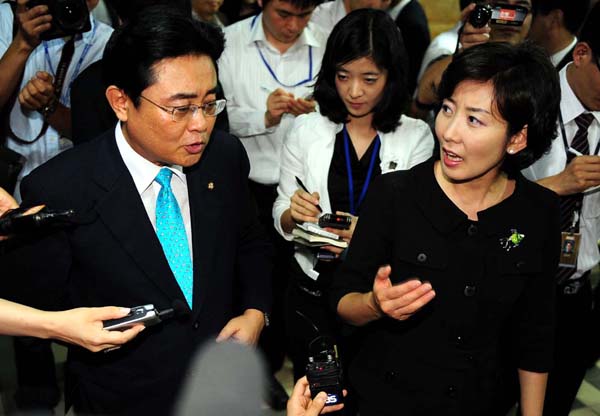 ▲ 미디어법 처리 문제로 여야의 대립이 계속되고 있는 가운데 14일 오후 민주당 의원들이 농성을 하고 있는 국회 문방위 회의실 앞에서 한나라당 나경원 간사와 민주당 전병헌 간사가 설전을 벌이고 있다.(뉴시스) |