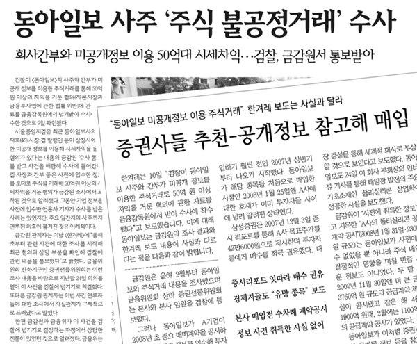 서울중앙지검은 금융감독원으로부터 동아일보 김재호 사장과 간부가 미공개 정보를 이용해 OCI(전 동양제철화학)의 주식을 거래, 수십억원의 시세차익을 올린 혐의와 관련 수사통보를 받고 사건을 금융조세조사1부(김강욱 부장검사)에 배당했다. 이 같은 사실은 한겨레 10일자 보도를 통해 처음 알려졌다.