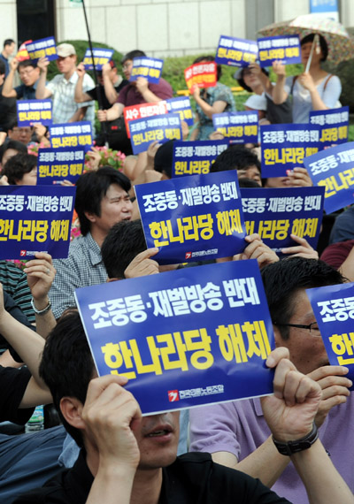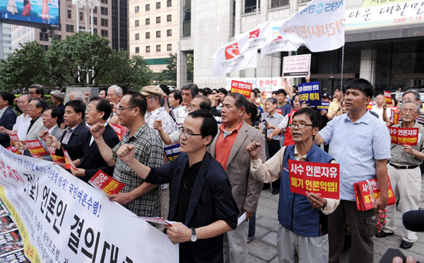 ▲ 19일 오후 '언론악법 저지 전(全) 언론인 결의대회'가 열린 서울 프레스센터 앞에서 참가자들이 언론악법 폐기를 외치고 있다. (뉴시스)
