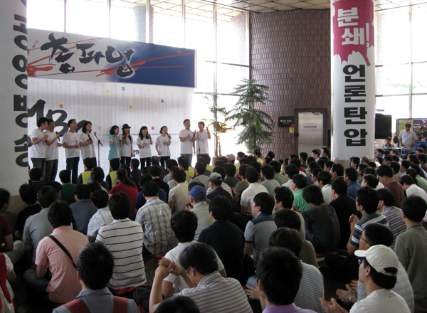 언론노조 SBS본부(본부장 심석태)는 이날 오전 11시 목동 SBS 사옥 1층 로비에서 비상총회를 갖고 총파업 참여를 선언했다. 200여명이 참여한 이날 비상총회에서 조합원들은 한나라당 언론관계법에 대한 대응 방안을 비롯해 SBS 사측의 임금 체불(5월 상여 미지급), SBS 지주회사 체제 문제 등을 논의했다.