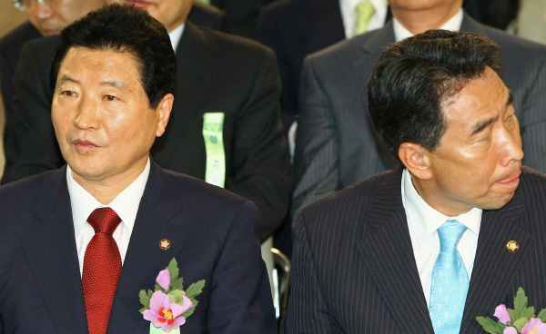 | ▲ 한나라당 안상수 대표와 민주당 이강래 원내대표가 지난 17일 국회에서 열린 제61회 제헌절 기념식에서 마주친 뒤 서로의 시선을 외면하고 있다.(연합뉴스) | ||
