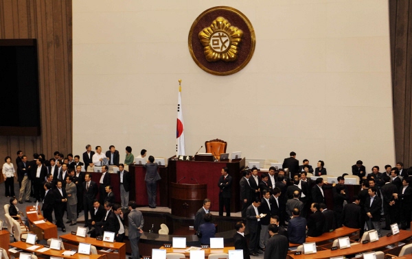 | ▲ 한나라당 의원들이 22일 오전 국회 본회의장에 입장, 의장석 주변을 에워싸고 있다.(뉴시스) | ||