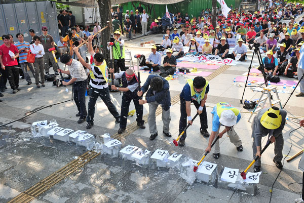 ▲ 21일 오후 여야가 미디어법 처리를 놓고 대치 중인 가운데 서울 여의도 국회 앞에서 언론노조 제3차 총파업 결의대회가 열리고 있다.(뉴시스) |