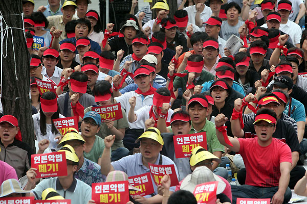 YTN 노조는 이날 오전 11시 조합원 80여 명이 참석한 가운데 서울 남대문로 YTN타워 1층에서 열린 YTN노조 총파업 출정식을 가졌다. 조합원들은 “언론악법 사라져라 비비디바비디부” “언론악법 폐기하고 언론자유 수호하자” 등의 구호를 외쳤다.
