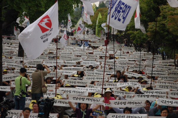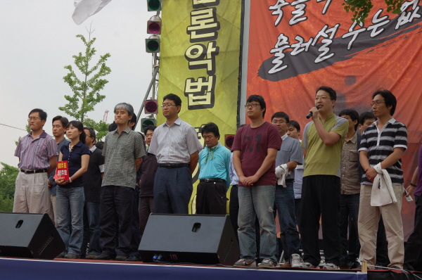 미디어법이 통과된 이튿날 서울 여의도 산업은행 앞에서 열린 ‘언론악법 원천무효 선포대회’는 2천명의 조합원들이 참석한 가운데 열렸다.