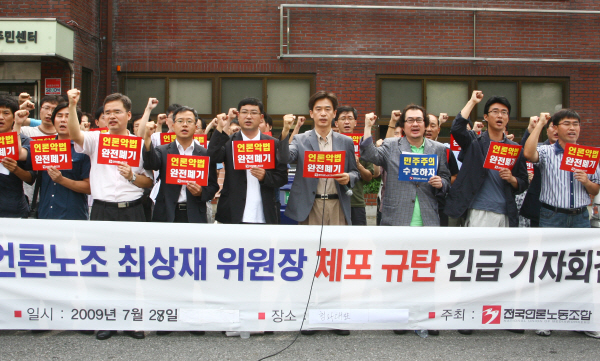 언론노조 소속 조합원들은 또한 이날 오전 9시30분 서울 청와대 부근인 청운효자동주민센터 앞에서 기자회견을 갖고 “1988년 출범 이래 현역 위원장 체포라는 초유의 사태를 겪고 있다”며 “이는 현 정권의 언론 정책을 비판하고 언론 장악을 위한 언론악법 처리에 반대하고 저항했기 때문”이라고 밝혔다.