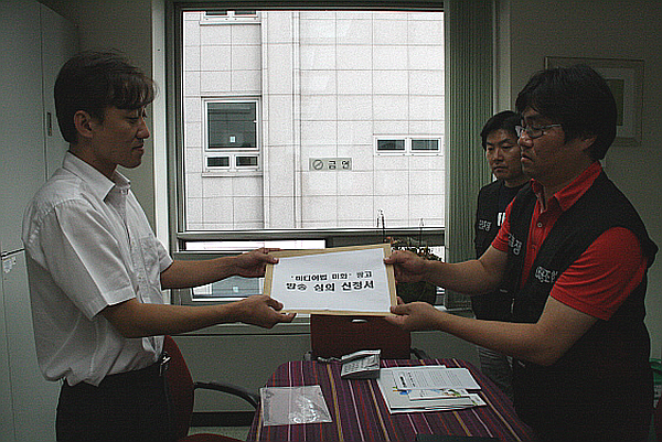 ▲ KBS 노조 최재훈 부위원장은 28일 오후 방송통신심의위원회에 미디어법 미화광고에 대한 방통위의 심의를 요청하는 신청서를 공식적으로 접수했다.