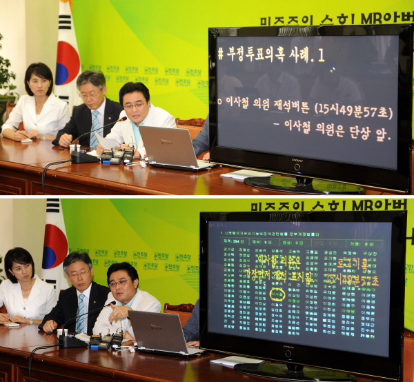 민주당은 주성영 한나라당 의원 자리에서 다른 의원이 표결 버튼을 누르는 장면을 비롯해 한 여성의원이 나경원 의원석에서 전자투표 단말기에 손을 대고, 한 남성 의원이 조해진 의원과 김태원 의원의 단말기를 터치하는 장면 등 7건의 대리투표 의혹 동영상을 공개했다.