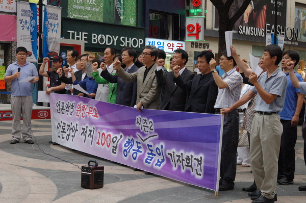 이들은 기자회견을 마치고 명동 거리에서 시민들에게 유인물을 나눠주고 ‘언론악법 반대’ 서명을 받았다. 명동 거리 서명은 1백일 동안 계속 진행될 계획이다.
