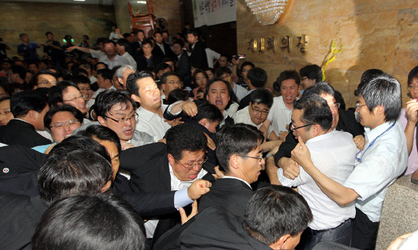 ▲ 미디어법 통과와 관련한 정부의 신문정책에 대해 지역신문계의 여론이 갈수록 악화되고 있다. 사진은 지난달 22일 미디어법 직권상정을 앞두고 국회 본회의장 앞 중앙홀을 점거 중인 민주당 당직자들과 한나라당 당직자들이 몸싸움을 벌이고 있는 장면.(연합뉴스) |