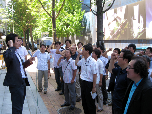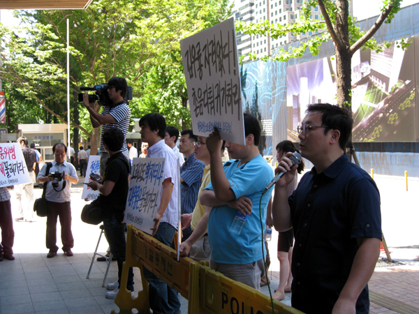 | ▲ 방문진 첫 이사회가 열린 10일 서울 여의도 율촌빌딩 앞에서 MBC 노조원들이 시위를 벌이고 있다.(김성후 기자) | ||