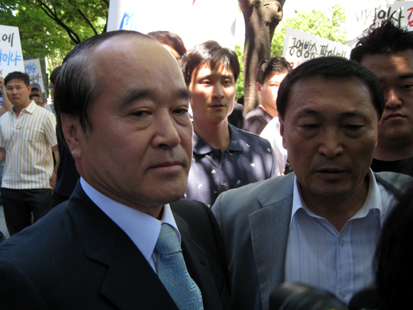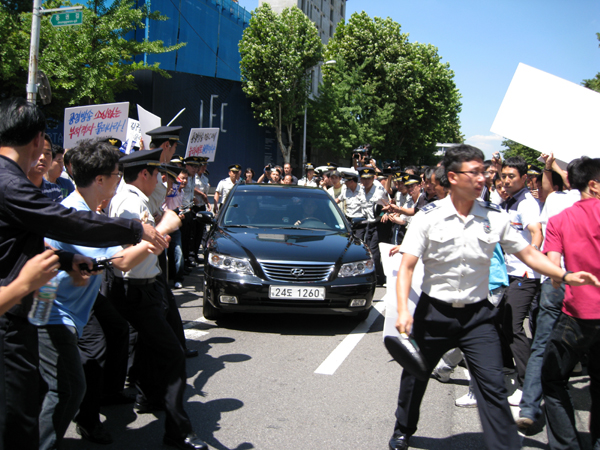 | ▲ 최홍재 이사를 태운 차량이 경찰의 호위를 받으며 율촌빌딩을 빠져나가고 있다. 노조원들은 차량을 가로 막으며 "최홍재는 사퇴하라"고 외쳤다. | ||