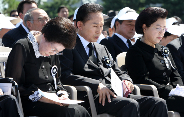 | ▲ 23일 국회에서 열린 고 김대중 전 대통령 국장 영결식에서 이명박 대통령 내외와 이희호 여사가 한승수 총리의 조사를 들으며 고인을 애도하고 있다.(연합뉴스) | ||