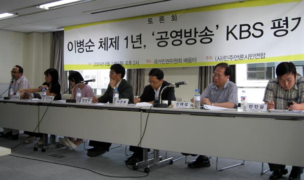 민주언론시민연합이 24일 서울시 중구 무교동 국가인권위 배움터에서 개최한 ‘이병순 체제 1년, 공영방송 KBS 평가 토론회’에서 참석자들은 이병순 사장 재임 1년 동안 KBS는 경영, 조직운영, 보도 등에서 총체적 문제점을 드러내고 있다고 지적했다.