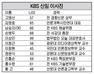 오는 7일 대통령에게서 임명장을 받을 KBS 새 이사진은 손병두 전 서강대 총장, 고영신 전 경향신문 상무, 김영호 언론개혁시민연대 대표, 남승자 전 KBS 보도본부 해설위원, 이상인 법무법인 오늘 대표변호사, 이창근 광운대 미디어영상학부 교수, 이창현 국민대 언론영상학부 교수, 정윤식 강원대 신문방송학과 교수, 진홍순 전 KBS 대외특임본부장, 홍수완 전 KBS 기술본부장, 황 근 선문대 언론광고학부 교수다.