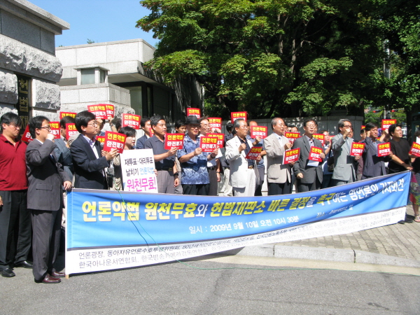 이들은 “결국 언론악법은 국민과 양식 있는 언론, 야당을 무시하고 재투표, 대리투표, 사전투표라는 헌정사상 초유의 불법적 방식으로 강행 처리가 시도됐으나 통과에는 실패했다”며 “이명박 정권과 정부 여당은 이를 기정사실화하는 조치를 지속적으로 취하면서 헌재에 부당한 압박을 가해왔다”고 밝혔다.