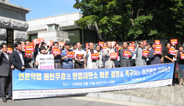 전·현직 언론인 원천무효 촉구전국언론노동조합을 비롯한 전·현직 언론인들은 미디어법 공개변론이 열린 지난 10일 오전 서울 종로구 가회동 헌법재판소 앞에서 기자회견을 갖고 “한나라당이 날치기 처리한 언론악법은 원천무효라는 점을 헌재가 올바로 밝혀주기를 강력 촉구한다”고 밝혔다.
