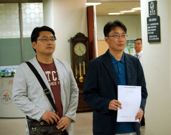 ▲ 임장혁 YTN 기자(전 돌발영상 팀장·사진 오른쪽)가 17일 낮 12시30분 서울중앙지검을 방문해 배석규 사장 대행에 대한 고소장을 접수했다. |