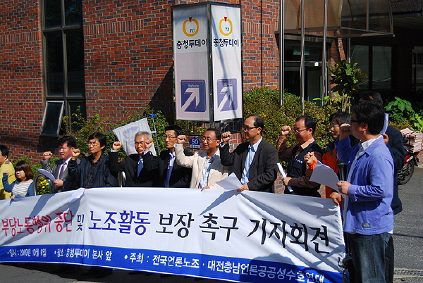 전국언론노동조합・대전충남언론공공성수호연대・대전시민사회단체연대회의 등은 6일 대전시 서구 갈마동 충청투데이 본사 앞에서 기자회견을 열고 “충청투데이는 부당노동행위를 중단하고 노조활동을 보장하라”고 촉구했다.