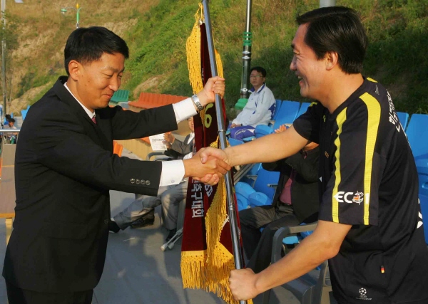 ▲ 10일 충북 청주에서 열린 시도협회 친선축구대회에서 대회를 주관한 충북기자협회 양승갑 협회장(사진 왼쪽)이 1위를 차지한 대전충남기자협회 류제일 협회장에게 우승기를 수여하고 있다.(사진제공=충청투데이) |