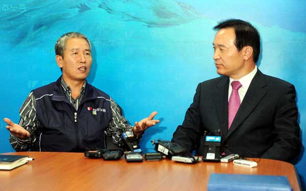 ▲ 임태희 노동부 장관(오른쪽)이 12일 오전 서울 영등포 민주노총 회관을 방문해 임성규 위원장과 대화를 나누고 있다. 정부와 노동계는 노조 전임자 임금 지급 문제를 놓고 평행선을 달리고 있다.(뉴시스) |