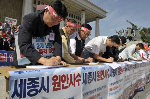 ▲ 지난달 22일 오후 국회 본청 앞 계단에서 자유선진당 이회창 총재를 비롯한 의원들과 충청지역 주민들이 세종시 원안사수 1천만명 서명운동 출범식에서 참석자들이 서명을 하고 있다.(뉴시스) |