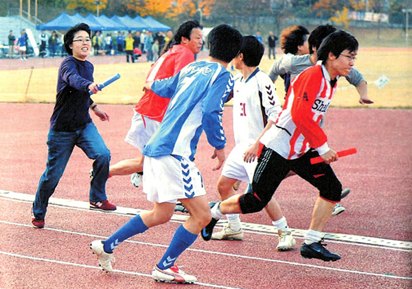 ▲ 지난해 열린 경남울산기자협회 체육대회에서 열린 릴레이에서 회원들이 바통 터치를 하고 있다. |