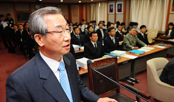 ▲ 헌법재판소가 29일 미디어 관련법 권한쟁의심판 사건 결정을 내리기로 확정함에 따라 결과에 관심이 집중되고 있다. 사진은 지난 5일 오전 서울 종로구 헌법재판소에서 열린 국회 법제사법위원회의 헌법재판소 국정감사에 참석, 인사말을 하고 있는 이강국 헌법재판소장.(뉴시스) |