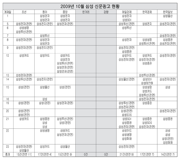 이 기간 조선일보는 15건(전면 11건), 동아일보는 17건(전면 4건), 중앙일보는 15건(전면 8건), 매일경제는 21건(전면 9건), 한국경제는 17건(전면 7건), 한국일보는 14건(전면 7건)의 삼성광고를 실었다. 거의 하루 한 번 꼴로 삼성 광고가 실린다는 것을 의미한다.