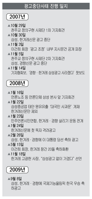 삼성은 2008년 2월26일 한겨레와 경향에 ‘이명박 대통령 당선 축하 광고’를 실은 후 올해 9월8일 ‘국제기능올림픽 한국 우승 축하광고’를 실은 것을 제외하고 2년여 간 광고중단을 지속하고 있다.