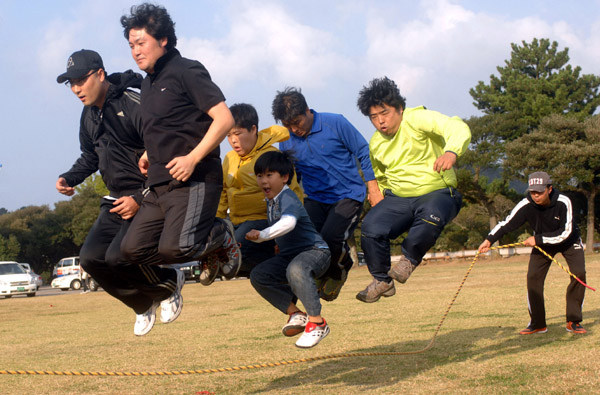 ▲ 24일 제주시 청소년학습센터 운동장에서 열린 제주기협체육대회에서 회원들이 줄넘기 경기를 벌이고 있다. |