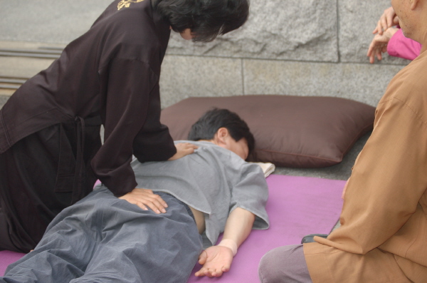 | ▲ 최상재 위원장이 1만배 중 탈진해 한 자원봉사자가 마시지를 해주고 있다. | ||