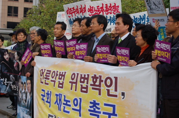 전국언론노동조합과 민주당, 시민사회단체 관계자들은 4일 서울 한국프레스센터 앞에서 기자회견을 열고 헌법재판소가 인정한 미디어법 처리 과정의 위법성을 해소하기 위해 국회가 즉각 재논의에 나서야 한다고 주장했다.