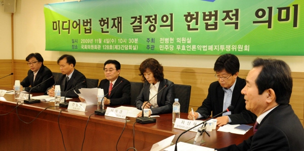전병헌 민주당 의원 주최로 4일 국회 의원회관에서 열린 ‘미디어법 헌재 결정의 헌법적 의미에 대한 전문가 간담회’에서 김종철 연세대 법학전문대학원 교수는 이같이 밝하고 “헌재 결정은 청구인인 야당 의원들이 승소한 것과 같은 의미를 갖는다”고 주장했다.