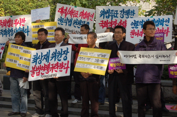 ▲ 미디어법 재논의를 요구하며 6일째 단식농성 중이던 최상재 위원장이 경찰에 연행되자 언론노조 및 시민사회단체 관계자들이 9일 서울 한국프레스센터 앞에서 긴급 기자회견을 열고 있다. |
