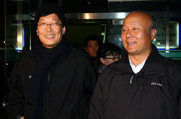 ▲ 미디어법 국회 재논의를 요구하며 단식농성 중 긴급체포됐던 최상재 언론노조 위원장(왼쪽)과 박석운 한국진보연대 대표가 10일 오후 9시30분쯤 서초경찰서에서 석방돼 웃음을 짓고 있다.(언론노조 제공) |