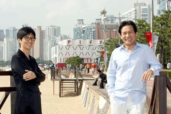 ▲ 부산일보 김은영 문화부장(왼쪽)이 부산국제영화제가 열리던 지난 10월 배우 안성기씨를 만나 인터뷰를 진행한 뒤 포즈를 취하고 있다. (부산일보 제공) |