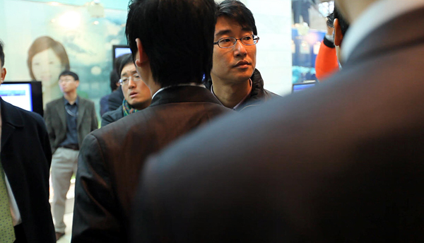 | ▲ 노종면 YTN 노조위원장이 사측의 출근저지에 항의하며 책임자의 해명을 요구하고 있다. (사진=YTN 노조) | ||