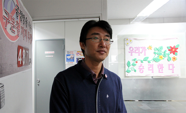 | ▲ 사측이 고용한 용역원들과의 실랑이 끝에 YTN 사옥 15층에 위치한 노조사무실에 첫 출근한 노종면 노조위원장. (사진=YTN 노조) | ||