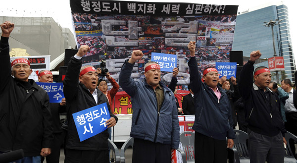▲ 세종시 논란이 충청지역에서 영남·호남권 언론까지 일제히 확산되고 있다. 사진은 지난 10일 오전 행정도시(세종시) 원안건설 촉구 시민사회정치 대표단 결의대회가 열린 서울역 광장에서 삭발 후 구호를 외치고 있는 참석자들.(뉴시스) |
