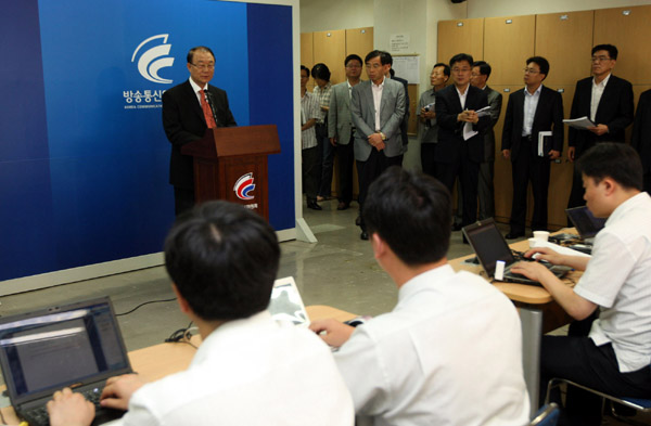 ▲ 최시중 방송통신위원장이 지난 7월 26일 오후 방통위에서 긴급 기자회견을 갖고 종합편성채널 및 보도전문채널 사업자 선정 과정에서 특정신문이나 특정기업에 대한 특혜나 배려는 없을 것이라고 밝히고 있다.(연합뉴스) |
