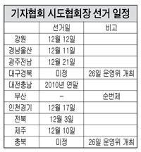 반면 신문·방송사 ‘순번제’로 하고 있는 부산협회(협회장 곽명섭)는 내년 2월쯤 방송 쪽에서 회장직을 맡게 되며 대전충남협회(협회장 류제일)는 올 초 협회장이 교체됐기 때문에 내년 말쯤 선거를 실시할 예정이다.