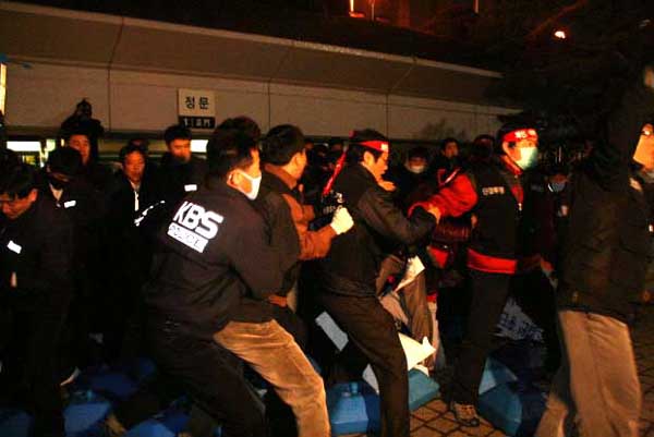 ▲ 26일 KBS 본관 정문 주차장에서 김인규 사장 출근을 저지하려는 KBS 노조원들과 이를 막으려는 청원경찰들이 몸싸움을 벌이고 있다.(KBS노조 제공) |