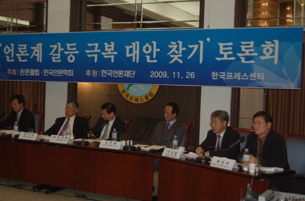 보수・진보 양 진영으로 갈라진 언론계의 갈등이 날이 갈수록 극심해지고 있다는 지적이 많다. 관훈클럽과 한국언론학회 주최로 26일 서울 한국프레스센터에서 열린 ‘벽을 허물자’ 3차 토론회 ‘언론계 갈등 극복 대안 찾기’에서 참석자들은 문제의 심각성과 저널리즘의 원칙을 재차 강조하는 데는 공감했지만 해법은 다소 차이를 보였다.