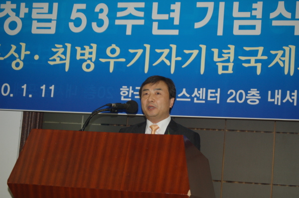 | ▲ 김진국 관훈클럽 총무가 11일 서울 한국프레스센터 20층 내셔널클럽에서 열린 창립53주년 기념식에서 인사말을 하고 있다. | ||