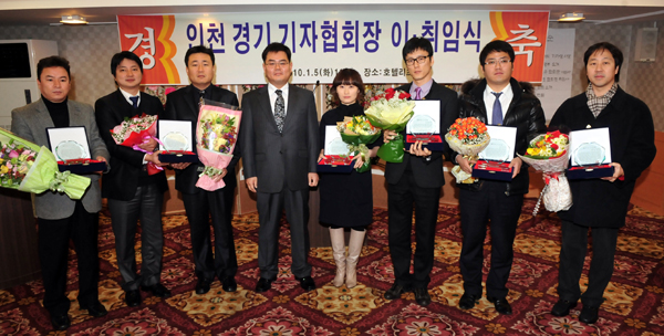 ▲ 시·도지역 협회별로 2009년을 결산하는 ‘올해의 기자상’ 시상식이 개최됐다. 사진은 5일 수원리츠호텔에서 열린 인천경기기자협회 회장 이취임식에서 기념 촬영을 하고 있는 김성규 전협회장과 올해의 기자상 수상자들. |